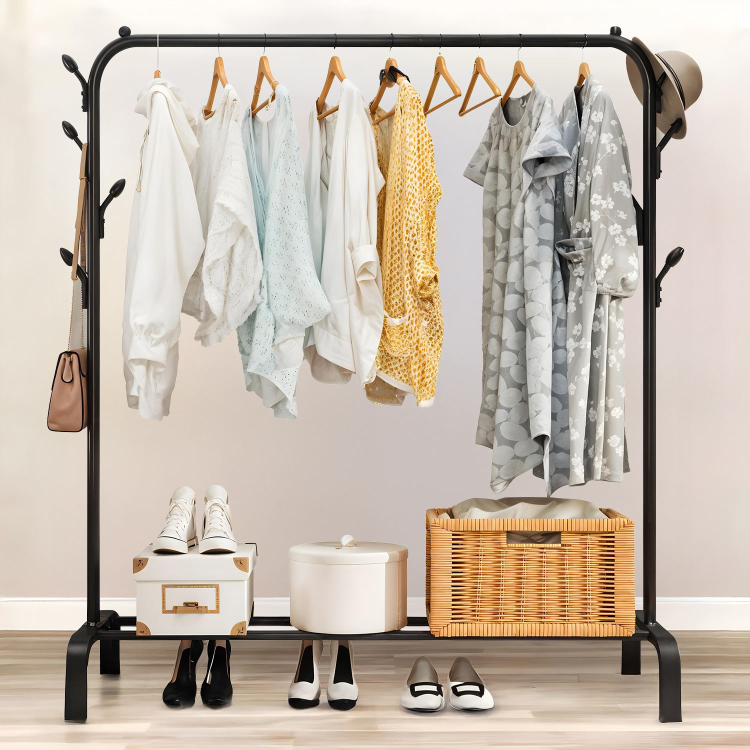- Dużo miejsca na odzież i dodatki – górna poprzeczka na wieszaki, boczne haczyki na torebki, szale, kapelusze.