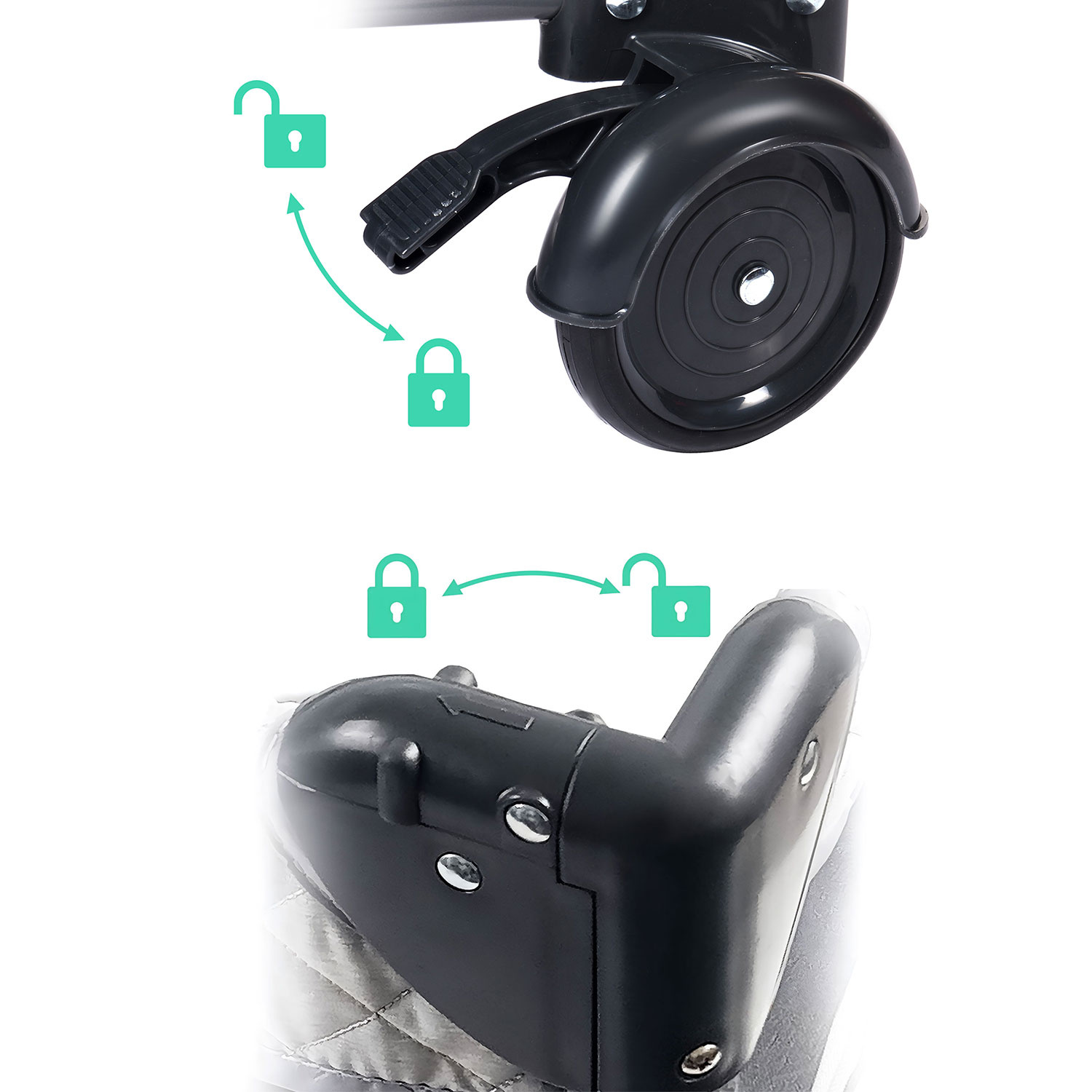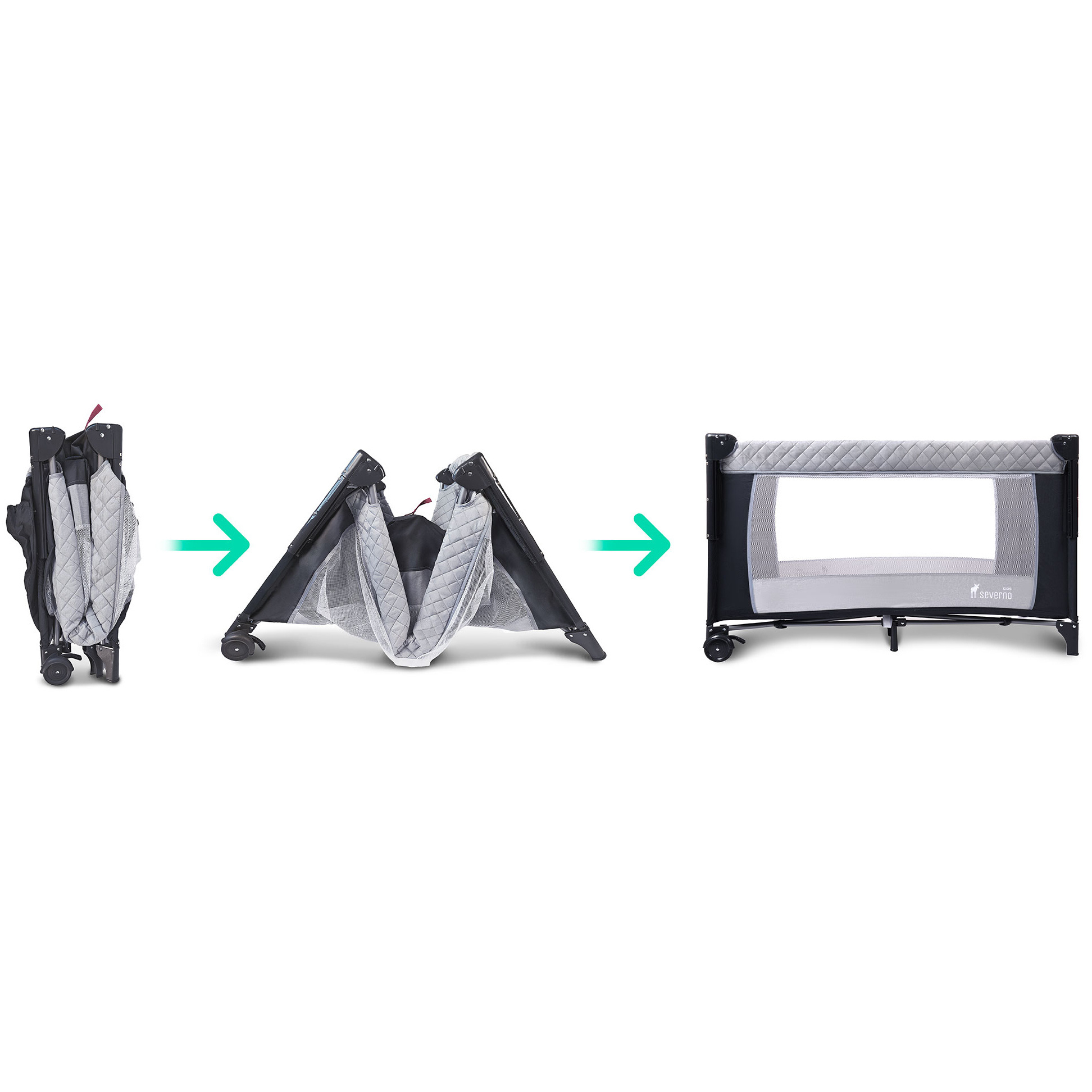 - System szybkiego rozkładania i składania łóżeczka oparty o podwójny system zabezpieczenia przez przypadkowym złożeniem/rozłożeniem