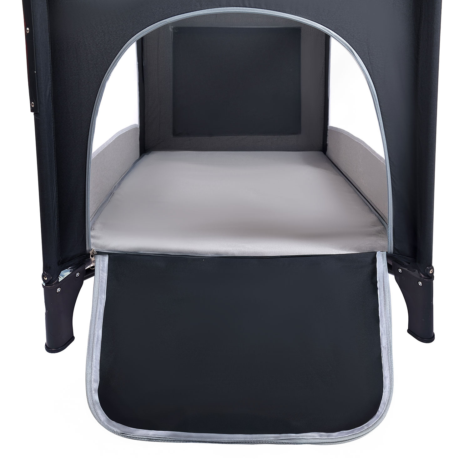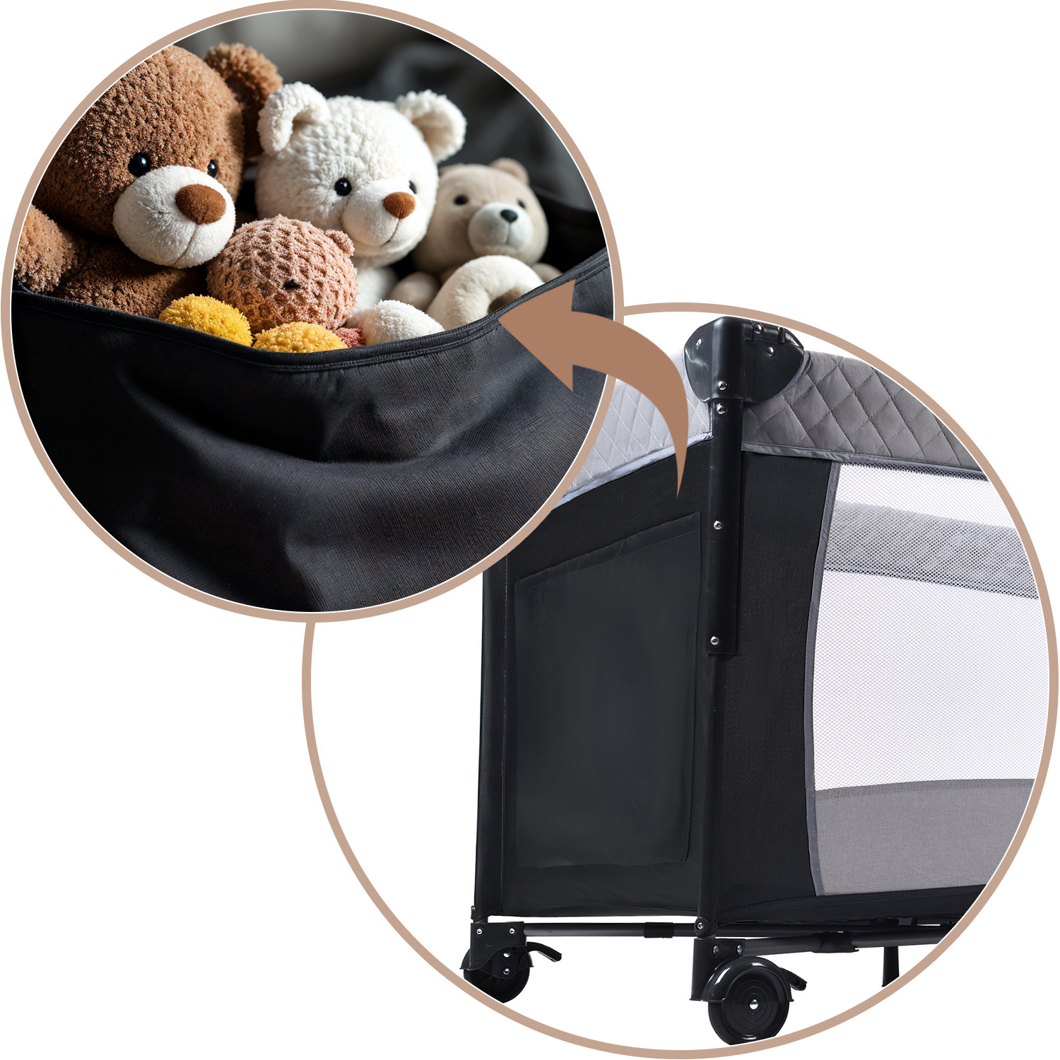 Łóżeczko zaplanowano z myślą o maksymalnej wygodzie dla maluszka i rodzica na co dzień. Boczne wejście zapinane na zamek błyskawiczny sprawi radochę starszym dzieciom. Rodziców ucieszy przewiewna, zapewniającą odpowiednią cyrkulację powietrza boczna siatka, która daje ponadto podgląd na pociechę.